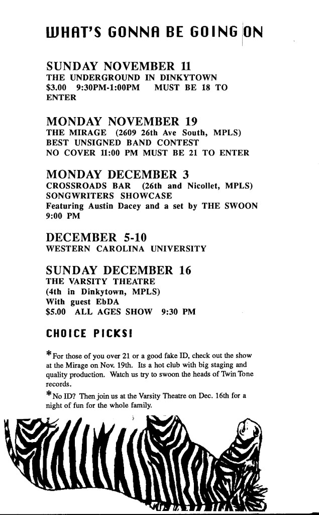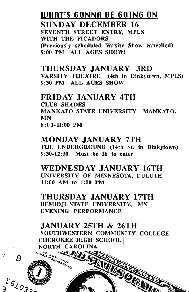 The line up of gigs for December 1990 looks like the regular MPLS bar and club scene we typically frequented except for one out of the way show at Western Carolina University in Cullowhee, North Carolina. Mark Derby and my fiancé Maria Z managed to book that one for the band by representing us at a southeast college showcase event. That was a heck of a drive, but the college shows paid big money. A college gig garnered thousands of dollars instead of the tens of dollars to which we were accustomed. A gig at a local club in Minneapolis, for example, might make $25 to $50 for a long night. If a school wanted to pay us two or three thousand dollars for a one hour show, we were willing to drive half way across the continent for them.