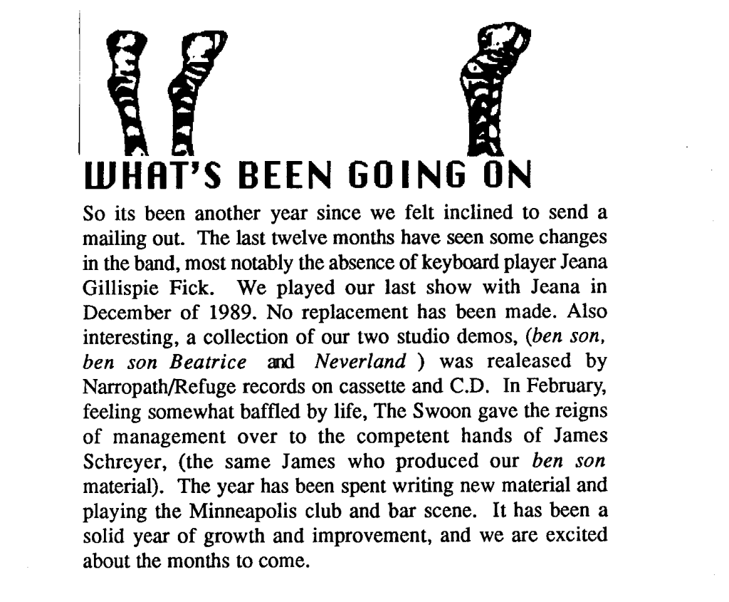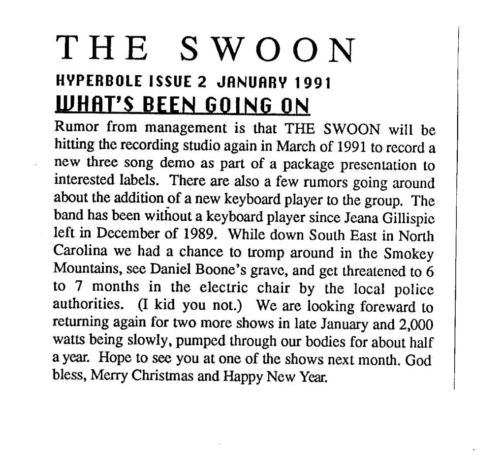 Issue 1 reviews the three big changes of 1990: the release of THE SWOON album, Jeana’s departure, and the introduction of James Schreyer as band manager.