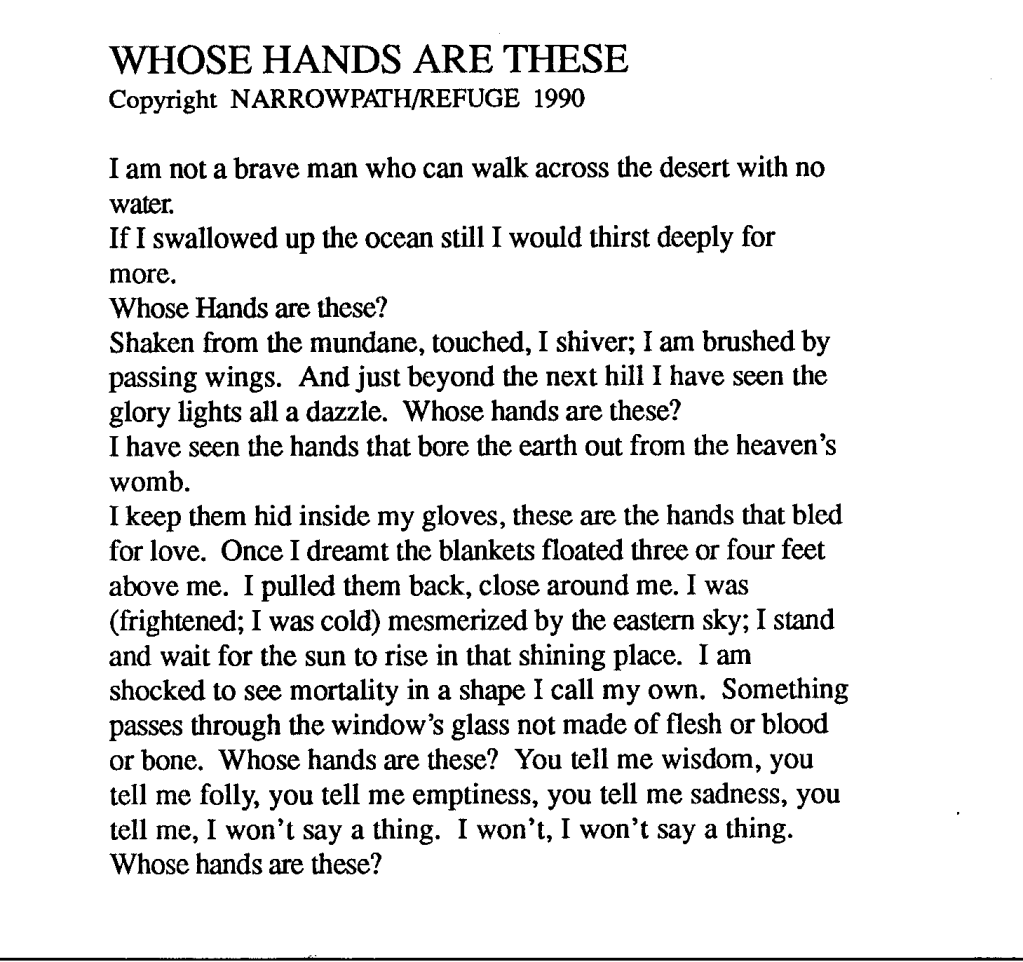 I included the lyrics to WHOSE HANDS ARE THESE just to set the record straight on that one. The studio version of the lyrics troubled me because, in the interest of keeping the song shorter for potential radio play, the producer cut out the punchline of the entire song: